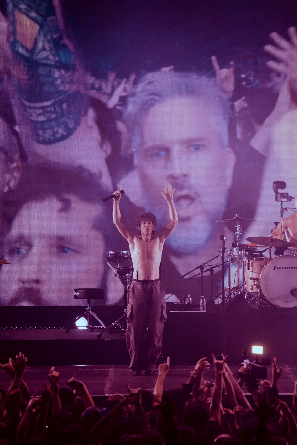 TURNSTILE débarque enfin sur les coups de 21h45. Le backdrop désormais classique aux différentes teintes de couleurs est bien là, tout comme les synthés, les riffs extrêmement travaillés propres aux petits gars (et fille, désormais) de Baltimore et la vigueur presque violente de Brendan Yates et ses acolytes. Sans prévenir, la tornade vient de frapper le nord-est de la capitale. D'un coup d'un seul, tout explose. Même l'intro de "Never Enough", pourtant planante dans un premier temps avant de monter en puissance ne laisse pas vraiment de place à la retenue. Quelques mois seulement après la sortie de l'album portant le nom du single, c'est une salle entière qui hurle les paroles à en faire trembler les murs insonorisés d'une salle qui en a pourtant vu d'autres. L'enchaînement avec "T.L.C. (Turnstile Love Connection)" en rajoute une couche, apportant déjà un constat implacable : porté aux nues ces dernières années, le groupe est devenu une véritable déflagration en live, une expérience d'une puissance et d'une intensité rares. C'est bien simple, il n'y a déjà plus le moindre centimètre carré de répit pour qui voudrait se réfugier loin de la folie qui s'est emparée de la fosse.