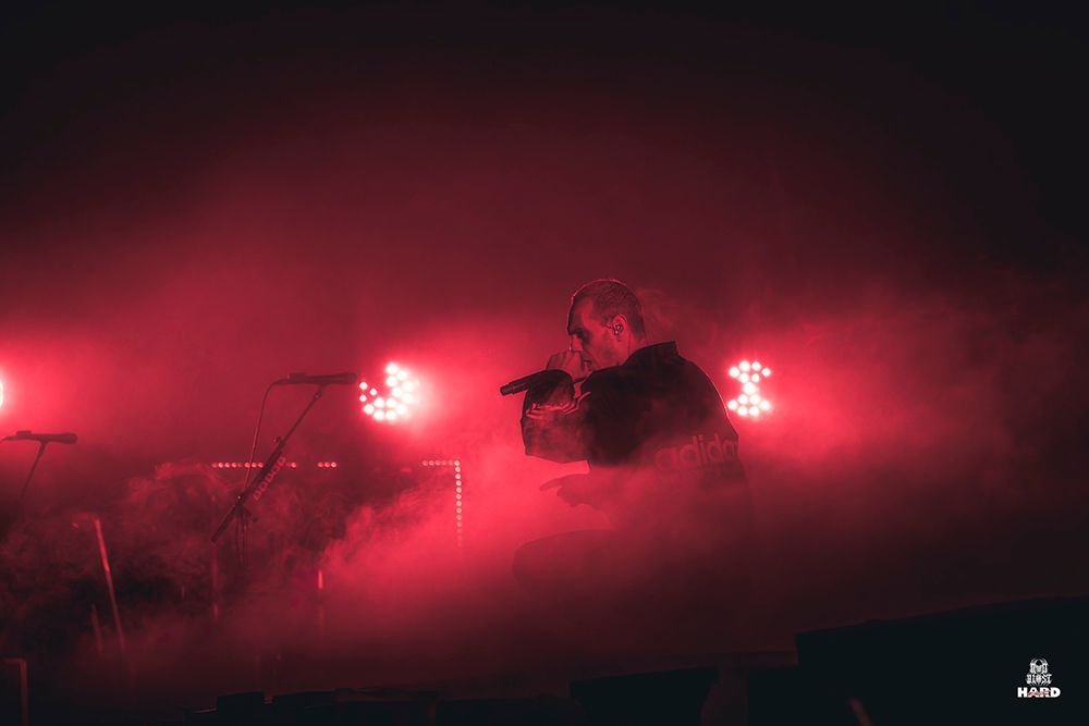 Derrière un rideau blanc, les marseillais de LANDMVRKS s'apprêtent à lancer le set headline le plus impressionnant qu'ils aient jamais joué en France, et la silhouette de Florent Salfati, guitare autour du cou, se dessine, lançant solennellement ''The Darkest Place I've Ever Been'', intro de l'album du même nom. Soudain, le morceau démarre vraiment, le rideau tombe, et on découvre une scène à la hauteur de la notoriété du groupe. Un écran gigantesque, des statues gonflables sur les bords, des bâches à l'image de la couverture de l'album sur les risers, et de l'espace pour bouger (très important avec LANDMVRKS) ... On est sur une vraie scène de tête d'affiche, et on en profite à fond dès les premières notes, de même que la fosse qui se transforme en véritable fourmilière ! Soudain, ''Creature'' commence, et on se surprend à connaître toutes les paroles, alors que les lance-flammes se déclenchent pour la première fois de la soirée. On remarque d'ailleurs au même moment que l'intégralité des gradins se sont levés, et que TOUT le public connaît les paroles sur le bout des doigts, preuve s'il en fallait de l'efficacité des hits des Marseillais. On connaît même presque par cœur le discours précédent ''Death'', nous invitant à chanter en même temps que le groupe les backing vocals de la chanson.