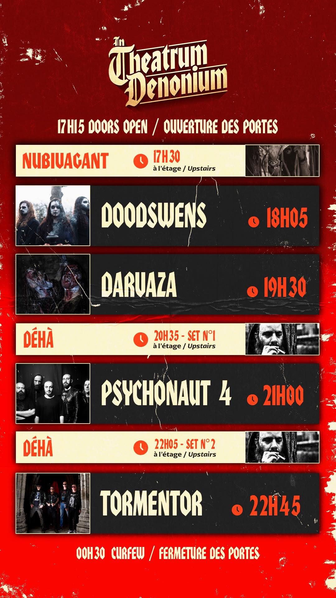 Sur la grande scène le rituel aura débuté avec DOODSWENS (Pays-Bas, 18h05), adepte d’un black traditionnel mais enrichi d’une dimension émotionnelle. DARVAZA (Italie/Norvège, 19h30) prendra la suite avec son black metal cru et intense. Le projet black metal atmosphérique NUBIVAGANT (17h30), mené par Gionata "Omega" Potenti, l’un des membres fondateurs de DARVAZA, se produira dans le fumoir, lieu magique où l’insatiable Belge DÉHÀ (20h35 et 22h05) offrira, au fil de la soirée, deux sets. Dernier groupe prévu, PSYCHONAUT 4 (Géorgie, 21h ) plongera le public dans le désespoir avec son depressive suicidal black metal hanté de tragédies personnelles.