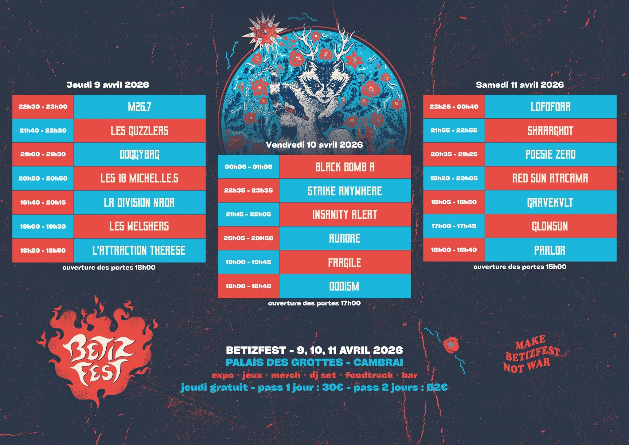 Vendredi ou samedi : 30€, pass deux jours à 52€ (hors frais de location) - Billetterie : Betizfest2026