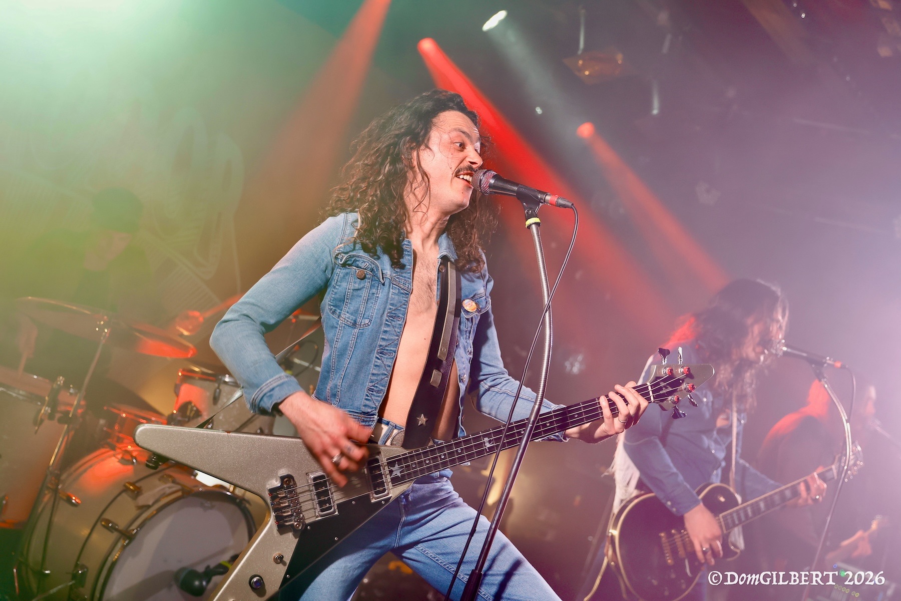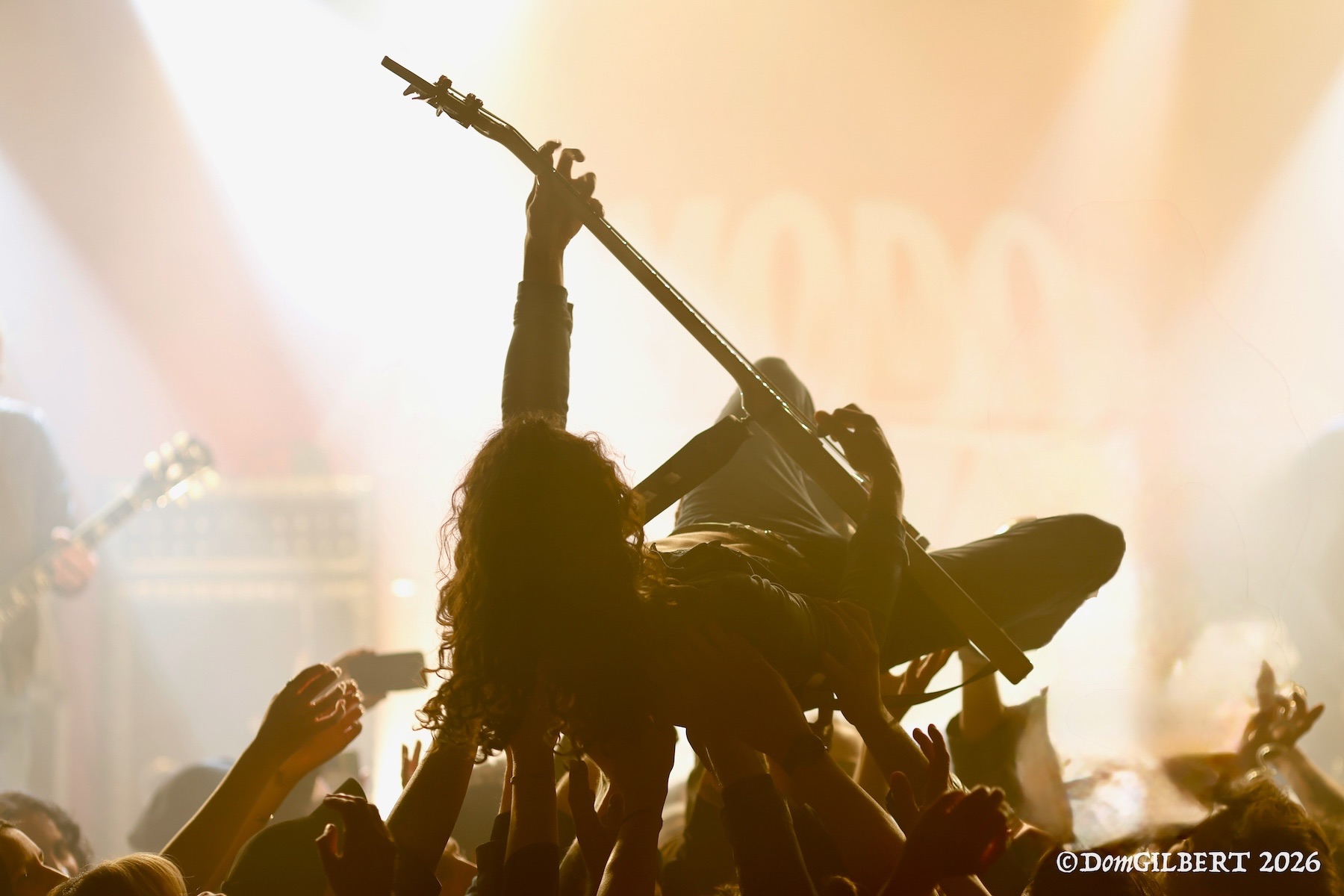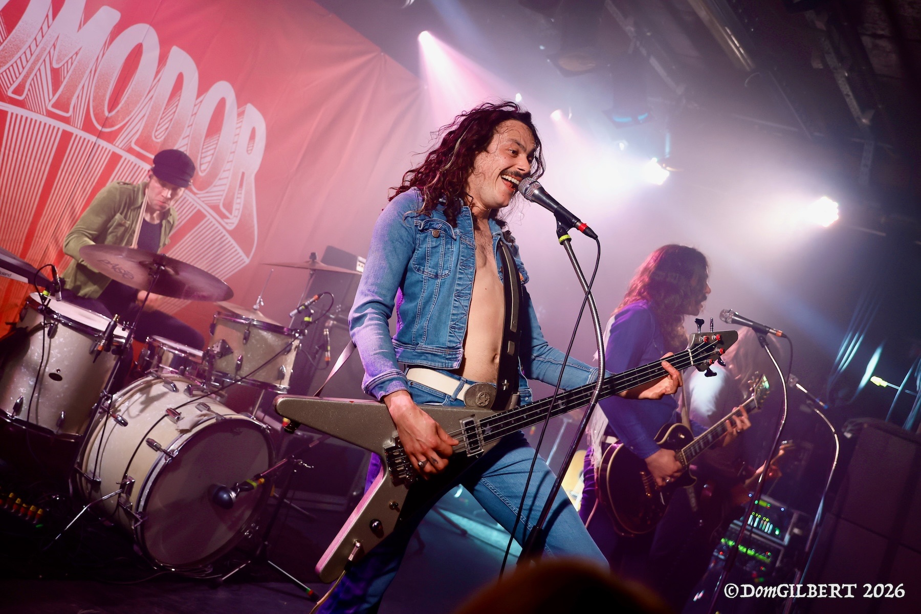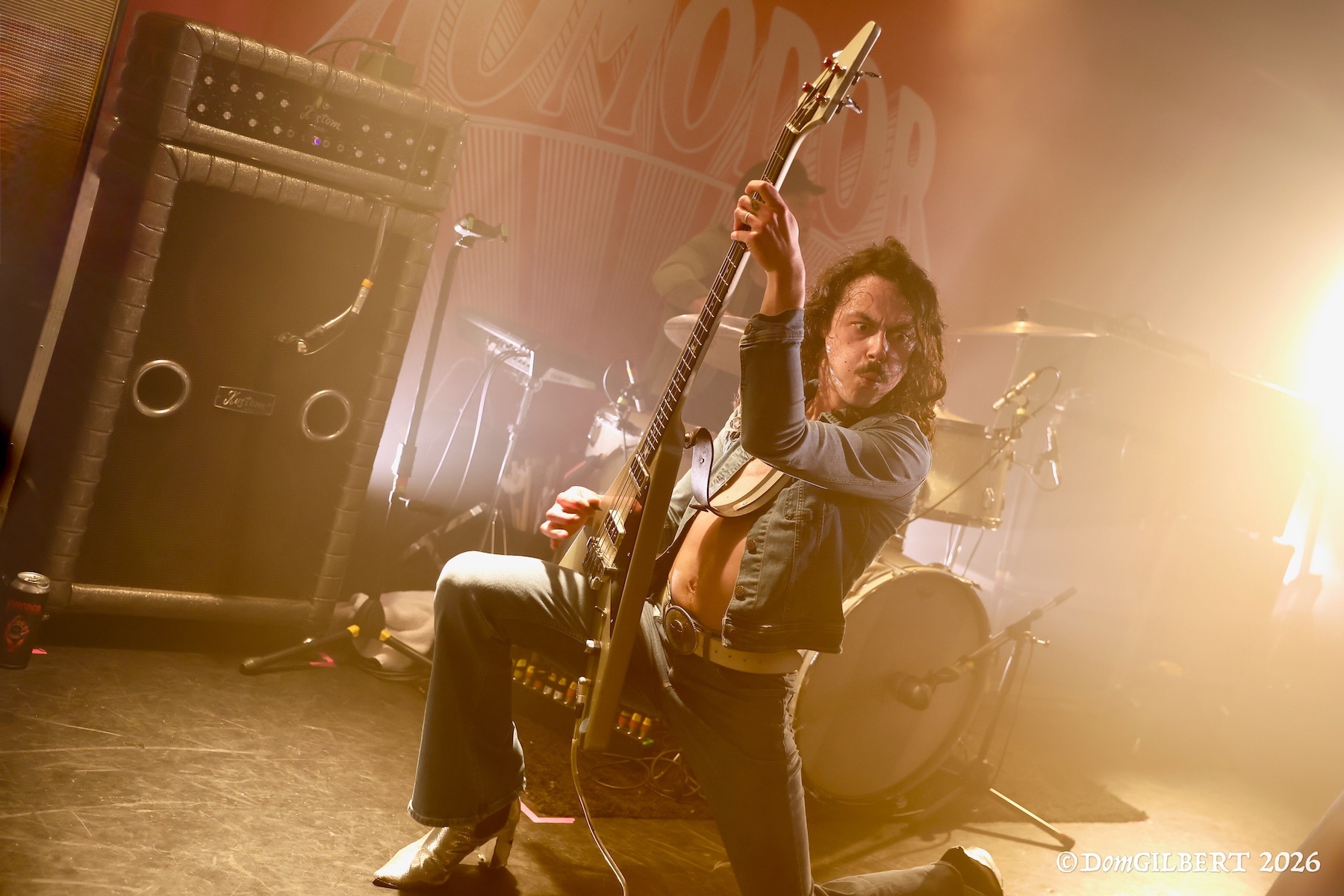 Mais KOMODOR remet rapidement les voiles vers un cap plus électrique via la reprise de SLADE « Know Who You Are », puis un « Nasty Habits » particulièrement énergique, durant lequel Goudzou et l’un des guitaristes, Slyde Barnett (oui, c’est un pseudo), slament dans la fosse, instrument en bandoulière. Pas forcément une bonne idée, d’ailleurs : Goudzou trébuche en revenant sur scène, s’étale en beauté, et finira le concert en boitant légèrement. Quant à Slyde, lui percute le micro en remontant sur les planches, apparemment sans conséquences.