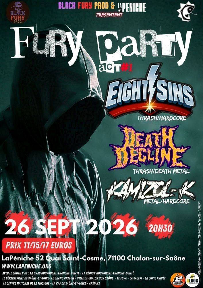 Pat : L'association a pour but d’organiser des évènements dans différents endroits, que ce soit à Chalon-sur-Saône et ses alentours. D’ailleurs on peut t’annoncer dès maintenant, on va faire une grosse soirée pour fêter notre première année d’activité, le FURY PARTY Act.1, ce sera à LaPéniche, une salle de Chalon-sur-Saône qui peut accueillir trois cents personnes et on aura ce soir-là trois groupes : KAMIZOL-K qui sont de Lyon, DEATH DECLINE de Dijon et EIGHT SINS de Grenoble en clôture de programmation. Ça va donc être un très beau plateau, en plus les groupes se connaissent bien, donc ça va être une belle soirée et on est très heureux de l’annoncer.