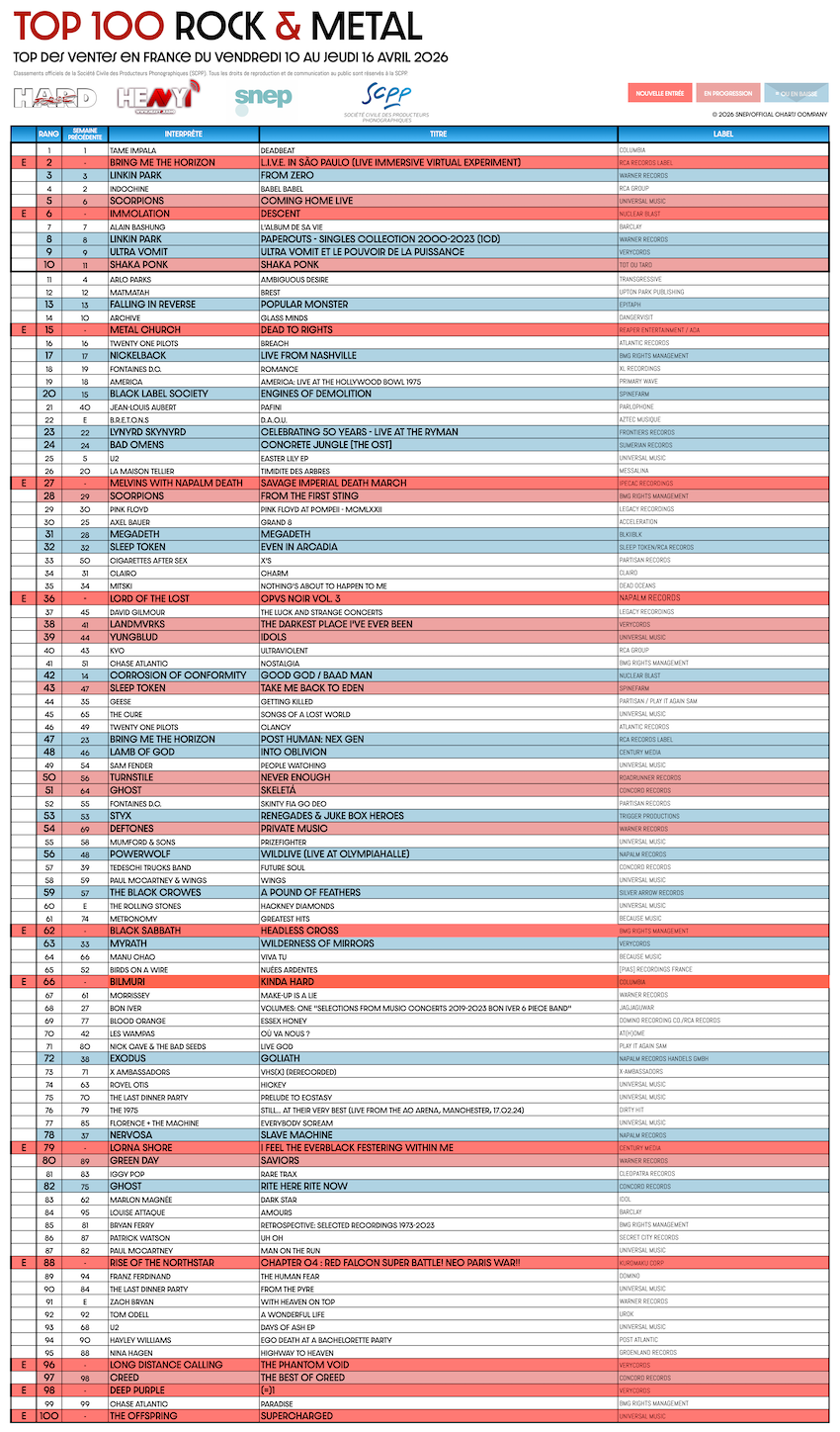 En partenariat avec le SNEP et la SCPP, ainsi que notre confrère ROLLING STONE FRANCE, HARD FORCE et HEAVY1 vous proposent le TOP 100 ROCK & METAL.