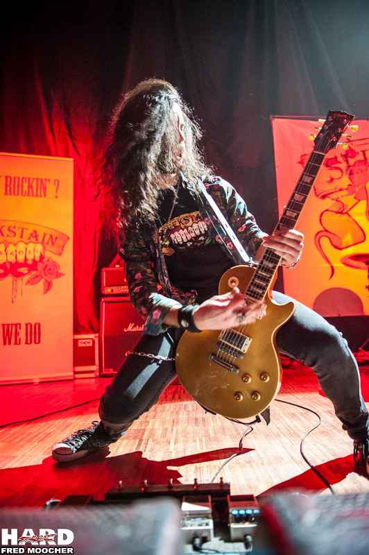 Mais comme le veut la tradition, place tout d'abord à la première partie ! C'est SLEEKSTAIN qui est chargé d'ouvrir la soirée. Né en Haute-Savoie il y a à peu près 5 ans, SLEEKSTAIN donne lui aussi dans le heavy metal à l'ancienne et dans le rock and roll. Celui des GUNS, d'AEROSMITH et de MÖTLEY CRÜE. Sur les planches, les quatre frenchies ne déméritent pas. Ça bouge, le son est correct et les codes vestimentaires sont respectés. Ryff (un pseudo visiblement), chante comme si il venait de descendre une bouteille de Jack Daniels avec David Lee Roth, et Deg martèle sa basse. Derrière les fûts, Vanns donne le tempo tandis que la guitare du prénommé Rob souffre d'un manque de présence dommageable, malgré des capacités évidentes. L'énergie déployée porte une performance néanmoins assez brouillonne aux compositions simples et brutes de décoffrage. Pour résumer, pas de quoi se lever la nuit, mais l'effort est à saluer. Tout à fait dans la tonalité, les SLEEKSTAIN remplissent leur part du contrat, portés par des fans purs et durs qui entonnent en chœurs les paroles des chansons.