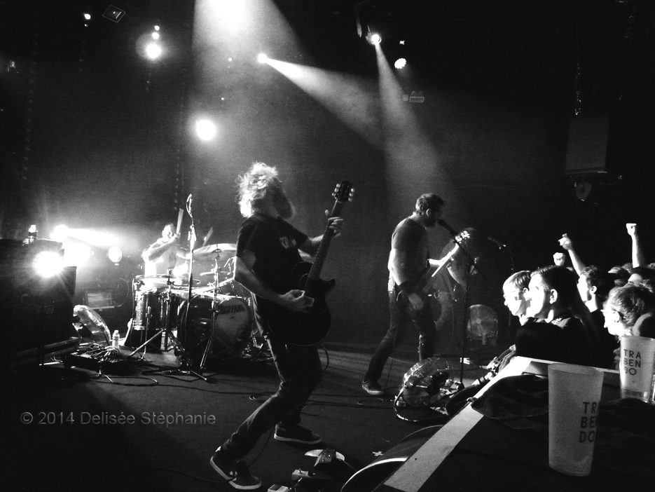 RED FANG. On les avait vu live au Hellfest 2011 sous la Valley, et on s’était pris une méchante mandale. En tant que monumental fanatique de stoner, faisant pour autant le tri dans toutes ces livraisons de nouveaux groupes estampillés deep south humide autour des leaders MASTODON et BARONESS ou KYLESA dans une moindre mesure, l’accueil réservé à leur deuxième album «Murder The Mountains» nous avait poussés à nous procurer le vinyle et à confirmer cette claque en concert dans la foulée. Même mal placés tant l’affluence rendait la visibilité pénible, on avait vraiment succombé à la puissance, lourde et simple, de ce heavy-rock aux relents stoner, proche en effet de leurs «grands-frères» MASTODON, mais aussi trousseurs de chansons plus directes et efficaces, avec pour modèle le meilleur du QUEENS OF THE STONE AGE des sacro-saints débuts. Depuis Clisson, RED FANG a arpenté les routes françaises en 2012, rejoué au Hellfest l’an passé, visité les Eurockénnes, et connait désormais largement mieux Paris qu’un banlieusard du 77 : en deux ans à peine, le groupe est passé au Bataclan, au Combustibles, au Glaz’Art... et le Trabendo ce soir. Sold Out. Complet mais pas étouffant pour autant, la jauge étant correcte, on circule, on respire, les bières ne se renversent pas de notre côté, latéral à la scène.
