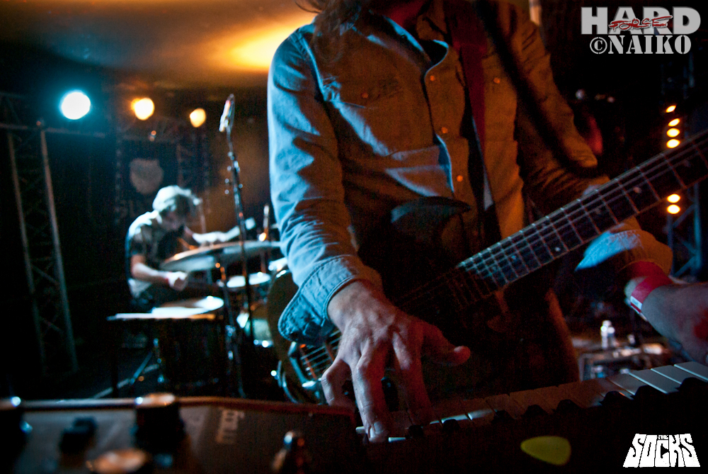 On pouvait déjà connaître THE SHOES, restait ensuite à découvrir THE SOCKS. Les quatre Lyonnais ont bien la pêche, ils adulent BLACK SABBATH et LED ZEP – comment leur donner tort ? Et… ça s’entend tout de suite. Résolument hard rock et psyché, les Frenchies cultivent aussi de manière très méritoire des tronches des années 70. Un très bon moment, sans aucun doute, et c’est bien le principal, mais pas beaucoup de points pour l’originalité – dommage.