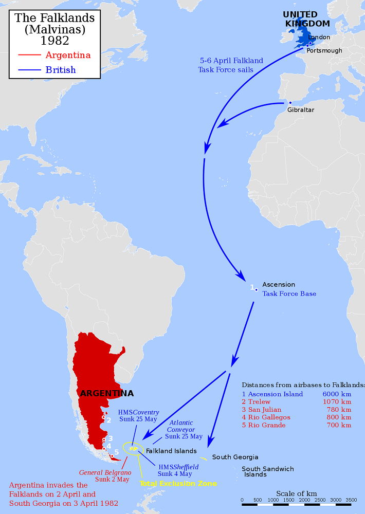 Le conflit est causé par la volonté de la dictature argentine de faire valoir par la force ses positions sur la souveraineté de ces archipels, placés par les Nations Unies sur la liste des territoires contestés. Ce conflit s'inscrit dans la continuité des controverses qui commencent dès la découverte de ces îles qui ont été occupées successivement par la France, l'Espagne puis le Royaume-Uni. Il s'agit, en 2019, du dernier conflit latino-américain où une nation non-américaine a été en guerre contre un Etat de ce continent. Au niveau humain, le bilan de cette guerre est de 907 tués soit 649 militaires argentins, 255 militaires britanniques et trois insulaires. Politiquement, la déroute argentine a de lourdes conséquences puisqu'elle précipite la chute de la junte militaire qui gouvernait jusqu'alors le pays et qui est remplacée par un gouvernement démocratiquement élu. De son côté, le gouvernement conservateur de Margaret Thatcher sort renforcé de cette victoire et est réélu en 1983.